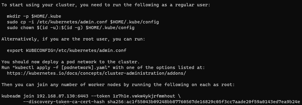 다음과 같이 명령어를 사용하게 되면 클러스터가 구축되고 명령어가 출력된다.
