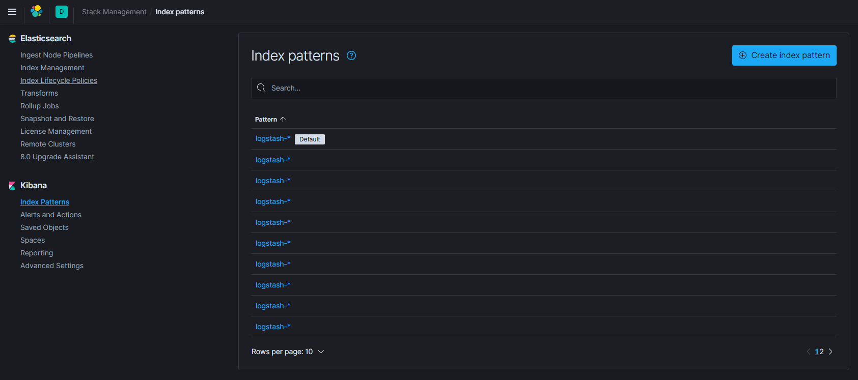 index pattern에서 logstash-* 를 패턴으로 지정한 후 로그를 수집할 수 있다.